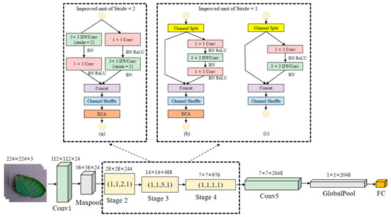The structure of ShuffleNetV2 units. (a) The structure of Stride = 1 unit; (b) The structure of Stride = 2 unit.