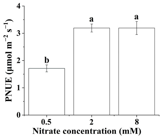 The PNUE of the B. papyrifera seedlings only showed significant differences at the lowest nitrate concentration. As shown in Figure 2, increasing the nitrate supply did not significantly affect the PNUE of the B. papyrifera seedlings when the nitrate concentration was in the range of 2 to 8 mM.