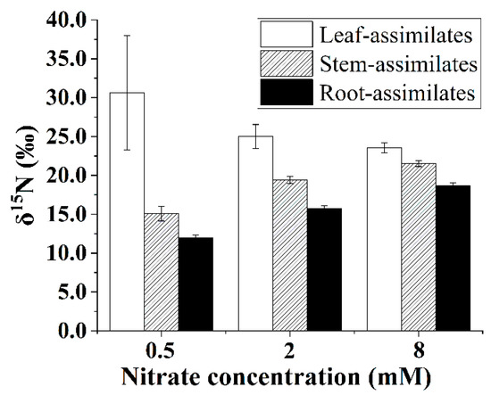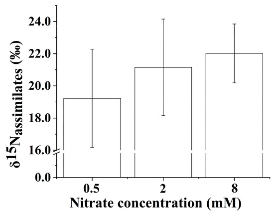 The δ15N values of the N assimilates in the whole B. papyrifera seedlings were negative compared to the initial source δ15N under the three nitrate regimes (Figure 5), which suggested that isotope discrimination occurred during the process of nitrate assimilation. Increasing the nitrate concentration contributed to enriching 15N in the N assimilates in the whole B. papyrifera seedlings. The δ15N values of the N assimilates in the whole B. papyrifera seedlings at the lowest nitrate concentration were distinctly lower than that at other nitrate concentrations.