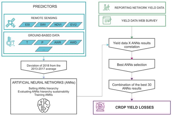 The workflow of the drought impact analysis of yield set for 2018. Artificial neural networks combine predictors and yield data from samples to estimate crop yield losses for the whole cadastral area level.
