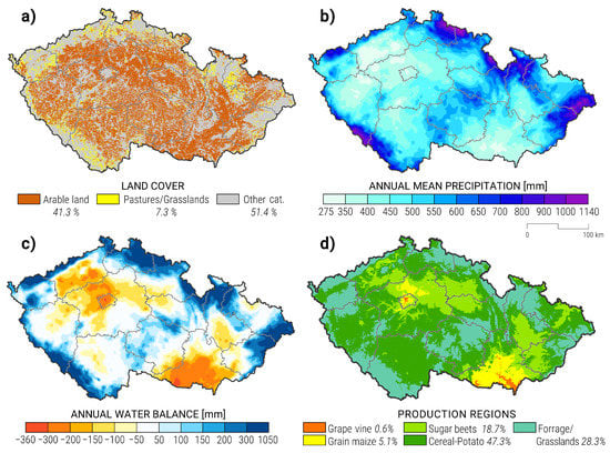 The basic administrative unit of the study was a so-called cadastral area. In total, there are 13,091 cadastral areas in the Czech Republic, with a total area of 78,000 km. The average size of a cadastral area is thus approximately 6 km or 600 ha, and over 53% of the whole area of the Czech Republic is classified as arable land (Figure 3a). Information about arable land is open to the public in the Land Parcel Identification System (LPIS) [40].