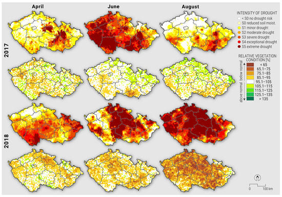 The intensities of the droughts and relative vegetation conditions (based on EVI2) provided for April, June and August of 2017 and 2018.