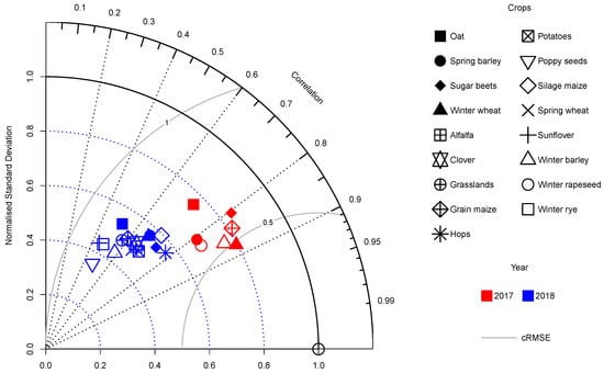 The results indicate that it was, in general, easier to determine cadastral areas that were entitled to obtain compensation in 2017 than in 2018. This can be clearly seen in the Taylor diagram (Figure 5), where symbols for all crops for 2017 indicate higher correlations and lower errors than their 2018 counterparts. The main reason for this result is the high spatial variability of the drought in 2018 across the whole Czech Republic in June and August. Similarly, the vegetation condition was worse over the whole Czech Republic in 2018 (Figure 4). In the crucial months of the growing season in 2017, there were especially persistent effects in the southwestern part of the Czech Republic. This result agrees with the poor vegetation status across the region.