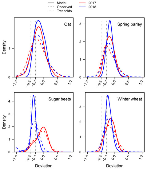 The sample data produced “lighter” tails than the modeled estimates (Figure 6). The only crop yield loss model with a high share of false positive results was the sugar beet model in 2018. The peak of the density in 2018 was left of the −0.3 threshold, meaning that many estimates fell into the compensation category (30% yield loss). At the same time, most of the observed and modeled yield anomalies were below zero (Figure 6); therefore, in most cadastral areas, negative yield anomalies were recorded.