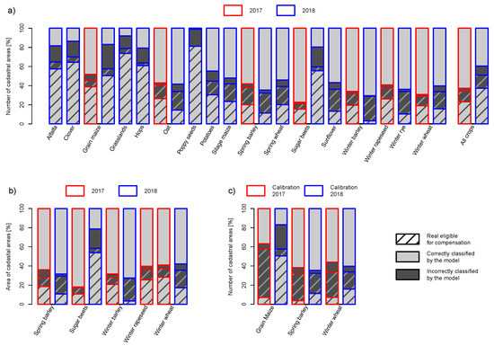 Scaled bar plots for both 2017 and 2018 showing the distributions of the successes of the model for all crops and the total distribution over all crops together (a) as a percentage of the number of cadastral areas; (b) as the percentage of the area of cadastral areas and (c) as a comparison between the distribution of the success of the model for 2018 with two different calibration datasets from 2017 and 2018. The results show that only the calibration dataset from the current year should be used. Overall error is the dark-grey box. False positive results are in the hatched area in the dark-grey box, and the partial error is the ratio of hatched dark-grey to full dark grey area.