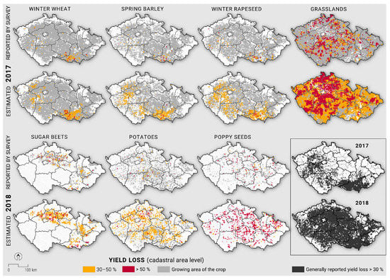For a spatial overview of the estimated situation compared to special questionnaire web survey outputs in the cadaster area level for both years 2017 and 2018, maps for individual crops were produced, and a spatial comparison between years 2017 and 2018 of reported crop yield losses over 30% where the highest loss over all crops for a given cadastral area was considered (Figure 8). Drought in 2017 had an impact on this general crop yield loss over 30% by copying of the annual water balance pattern (Figure 3c). Drought in 2018 affected mostly the complement of the growing area compared to in 2017 (Figure 4). Therefore, the crop yield losses over 30% were over the whole growing area of the Czech Republic in 2018.