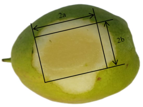 A widely used method (elliptical area method) was chosen to measure the damaged area. The fragrant pears after the static pressure damage test were put in static for a period and the pericarps at damage positions were removed with a knife. After extrusion, the pear damage is generally a hidden damage when the damage is small, and the damage is hidden under the peel. Therefore, the peel must be removed to observe the damaged state. As shown in Figure 2, the major semi-axis (a) and minor semi-axis (b) of the damage area were measured three times, respectively, and the means were collected. The damage area was calculated according to the method proposed by Liu [7], Yu et al. [17] and Mohsenin et al. [18].