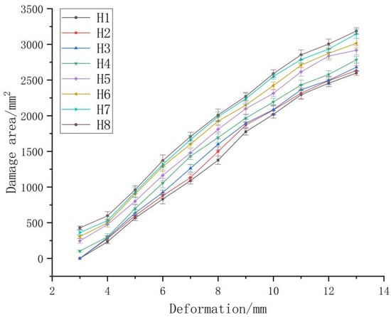 It can be seen from Figure 5 that the damage degree of fragrant pears increases with the increase of ripeness or deformation volume. When deformation volume was <3 mm, fragrant pears in all harvest periods had no damage, because they had not reached the yield limit yet. The pericarp developed elastic deformation, as shown in Figure 6. When deformation volume = 3 mm, fragrant pears of H1–H3 did not develop damage due to the low ripeness and high hardness in this period. The deformation volume of 3 mm cannot exceed the yield limit of fragrant pears. Differently, fragrant pears of H4–H8 all develop damage because the hardness of fragrant pears decreases with an increasing ripeness, and the deformation volume of 3 mm exceeds the yield limit of fragrant pears. When the deformation volume is ≥4 mm, the elastic deformation of the pericarp of fragrant pears is changed to plastic deformation and fragrant pears of all harvest periods develop damage. When deformation volume was >13 mm, fragrant pears of all harvest periods developed cracks, thus losing their commodity value, as shown in Figure 7. Given the same degree of ripeness, the damage areas of all fragrant pears with a small deformation volume are smaller than those of fragrant pears with large deformation volumes. This is because with the increase of squeezing force, the plastic deformation of fruits is intensified and the damage area increases accordingly. Given the same deformation volume, the damage areas of fragrant pears with low ripeness are smaller than those of fragrant pears with high ripeness. This is because as the squeezing force increases, the cell wall structure and composition of fruits change with the increase of ripeness, manifesting as thinning the cell wall and the disappearance of abundant cell wall structures [25]. The cell wall has a protective effect. Hence, the stress tolerance declines with increasing ripeness, and the fruits are more easily damaged.