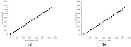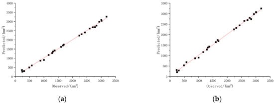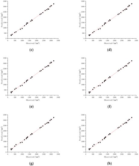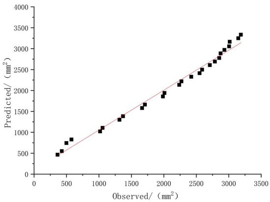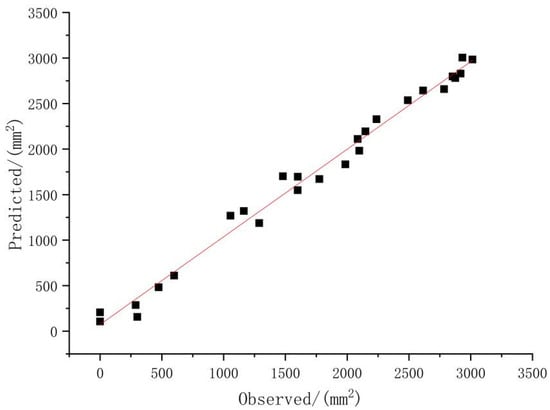 The squeezing damage test of fragrant pears was carried out in 2022 to verify the actual prediction effect of the optimal model. Pear samples were collected every four days from 1st September to 29th September. The harvest periods were designated as H1, H2, H3, H4, H5, H6, H7 and H8. The corresponding ripeness degrees were designated as 1, 2, 3, 3, 4, 5, 6, 7 and 8, respectively. Under the squeezing deformation volumes of 3 mm, 5 mm, 7 mm, 9 mm, 11 mm and 13 mm, the damage area was measured. Using ripeness and deformation volume as inputs, the damage areas of fragrant pears were predicted. A linear fitting between the test values and the predicted values was carried out, as show in Figure 11.