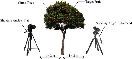 The images used in this paper were obtained from a citrus orchard at South China Agricultural University, Guangzhou, Guangdong, China (113° E, 23° N), and the image acquisition experiments were conducted on 3 July 2022 and 20 December 2022. As shown in Figure 1, the distance between the camera and the citrus tree trunk is 1–2 m, and the citrus fruit is photographed from multiple angles during the image acquisition process. To meet the diversity of the dataset, images under different lighting conditions were also considered, and were taken from 9:00 a.m. to 20:00 p.m. A total of 1940 citrus images were collected and saved in a JPG format with 640 × 480 resolution.
