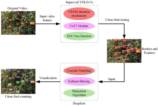 The flow chart of the proposed method is shown in Figure 2. First, the YOLOv5s network model is improved by adding the CBAM attention mechanism, fusing the CoT3 module in the backbone network and replacing the SIoU loss function in three ways, and a target detection model is trained using the self-built dataset for detecting citrus fruits in images. The video to be detected is fed into the trained citrus fruit detection model as video frames for target detection and followed by feeding the detected target borders and image features into the DeepSort algorithm for fruit counting; finally, the results are displayed as visualizations.