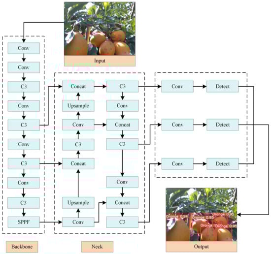 The YOLO algorithm is currently the mainstream target detection algorithm, with YOLOv2 [], YOLOv3 [], YOLOv4 [] and YOLOv5 [], which are a series of algorithms proposed one after another. The YOLO series algorithms meet in real-time at the same time as the detection accuracy improves; the algorithm improvement research also becomes more and more mature. The YOLOv5 series is divided into YOLOv5s, YOLOv5m, YOLOv5l and YOLOv5x [], depending on the depth and width of the network. In this paper, based on the actual scene requirements and configuration, the YOLOv5s model is used as the base network architecture. It mainly consists of four parts: Input, Backbone, Neck and Output, and its network structure is shown in Figure 3. However, we found that YOLOv5s has some defects during the experiments, such as the missed detection of obscured objects and the wrong detection of background objects. Therefore, this study improves the basic YOLOv5s model based achieving a higher accuracy in citrus fruit recognition, while ensuring the real-time performance of the model.