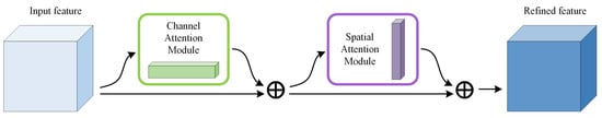 The role of the attention mechanism [] is to allocate the limited information processing resources to the more important parts. Attention mechanisms can be divided into channel attention mechanisms and spatial attention mechanisms. Compared with other attention mechanisms, the advantage of CBAM is that it contains both modules, the channel attention mechanism and spatial attention mechanism [], and its adaptive feature modification of the feature map through these two sub-modules enhances the importance of the spatial location information and channel information features of the feature map. This improves the detection effect of the network model on the target and improves the representation capability of CNNs, whose structure schematic diagram is shown in Figure 4.