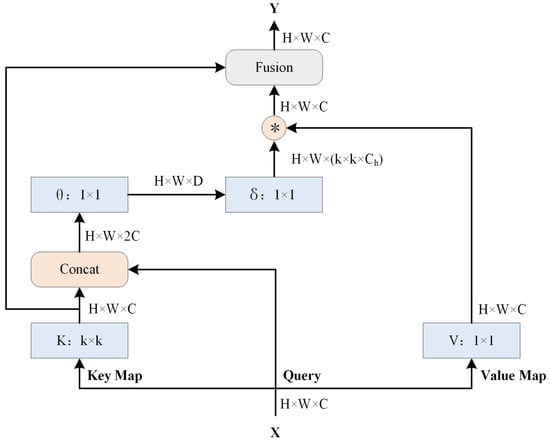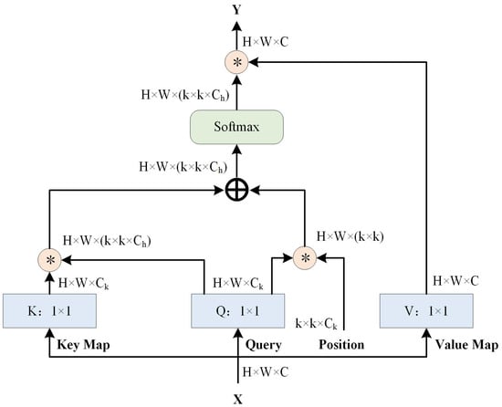 The structure of the modules before and after the improvement is shown in Figure 5 and Figure 6. In the traditional self-attention module, the Key, Query and Value are obtained by a 1 × 1 convolution, and the multiplication of the pairs of Key and Query ignores the context information in the neighboring Key. In contrast, in the CoT module, the Key and Query take the original value directly, and the adjacent Key undergoes a k × k convolution to obtain the context information and connects it with the Query module. Then, the connected result is convolved by two 1 × 1 convolutions to obtain the attention matrix, and finally multiplied with the value after the 1 × 1 convolution to output the result. This result fully exploits the contextual information between neighboring Keys compared with the result obtained by the self-attention module, thus enhancing the visual representation.