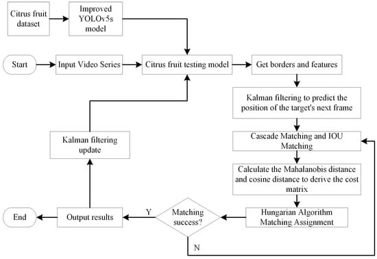 In terms of fruit counting, the traditional Sort algorithm has a very obvious problem related to the frequent switching of ID during the counting process, and it is only applicable to the counting in the case of no occlusion; meanwhile, in the problem of citrus fruit counting, it often happens that the fruit is occluded by other factors such as branches and leaves. Thus, the algorithm is not applicable to the counting of fruit. To address this problem, Wojke N. [] proposed the DeepSort multi-target tracking algorithm, which was improved based on the traditional Sort algorithm to improve the tracking accuracy of the tracked object in the case of multiple occlusions and to reduce the frequent switching of ID.