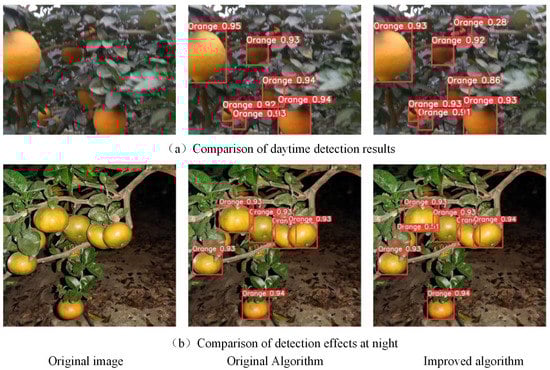 In order to more intuitively reflect the performance of the improved algorithm, the citrus fruits were detected using the YOLOv5s algorithm before and after the improvement, as shown in Figure 8. Two sets of photos were selected: daytime with occlusion and nighttime with occlusion. From the detection results in both sets of photos, it can be observed that the improved YOLOv5s algorithm can identify more targets in both daytime and nighttime, and can identify targets that are occluded by branches and leaves without false detection, which is a better performance. This demonstrates that compared with the original algorithm, the improved algorithm has a higher recognition accuracy for citrus fruits and can achieve more accurate recognition and localization in the case of occlusion. Its network detection speed FPS is 84, which is reduced but still maintains a good real-time performance, indicating that the improved algorithm is more suitable for the recognition of citrus fruits in orchards.
