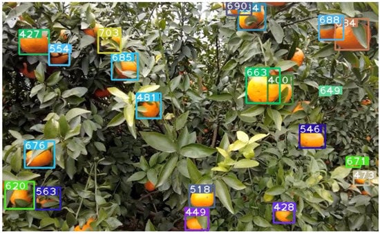 Meanwhile, the information of citrus fruits detected by the improved YOLOv5s algorithm is input into the DeepSort algorithm, and the counting of citrus fruits can be realized, as shown in Figure 9.
