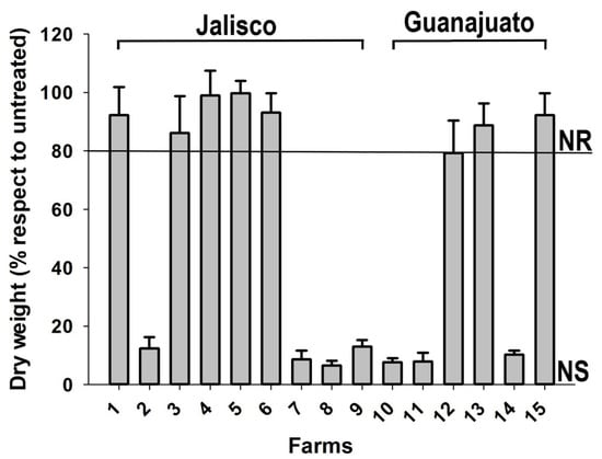 Percentages of dry weight (m2) of different farms treated with nicosulfuron (50 g ai ha−1) in corn fields infested with Mexican grass (Ixophorus unisetus). NR: nicosulfuron-resistant; NS: nicosulfuron-susceptible.