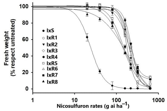 The nicosulfuron rates necessary to reduce plant growth (GR50), plant mortality (LD50), and enzyme activity (I50) were estimated using the transformation of the plant weight to a percentage with respect to the untreated control. The rates were used to create dose–response curves with non-linear regression analyses with a three-parameter log-logistic model using the equation y = d/[1 + (log(x) − logI)b], where d is the coefficient of the upper limit; b is the slope of the curve in the point of inflection halfway between the upper and lower curves (fitted to zero); e is the herbicide dose in GR50, LD50, and I50; and x is the herbicide dose (depending on the herbicide) []. Resistance indices (RIs) were calculated dividing the GR50, LD50, or I50 of the putative-resistant population by the same parameter as the sensitive population.