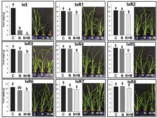 Fresh weights of Ixophorus unisetus populations treated with nicosulfuron (N), nicosulfuron + malathion (N + M), or untreated control (C). Bars represent the mean of plants (n = 10). Letters are the aggrupation after Tukey’s test. The same letter indicates no significant differences between treatments.