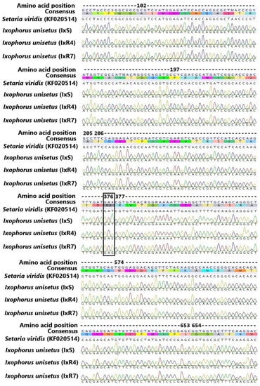 Partial ALS gene sequencing was performed in three I. unisetus populations (one susceptible and two resistant) covering nine known resistance-conferring point mutation sites. The sequence alignment of resistant plants (IxR4 and IxR7) showed a single-nucleotide change, from GAT to GAG, in amino acid position 376, which results in a change from aspartic acid to glutamic acid (Asp376Glu). No other nucleotide changes were found in the three I. unisetus populations (Figure 5).