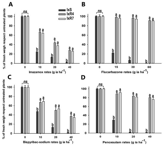 Fresh weights of Ixophorus unisetus populations tested (IxS, IxR4, and IxR7) after four ALS-inhibiting herbicides (A) imazamox, (B) flucarbazone, (C) bispyribac-Na, and (D) penoxsulam. Bars represent the error mean of the plant treated (n = 20). Different letters represent the grouping after Tukey’s test. ns= no significant differences.
