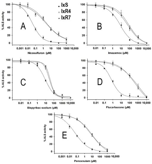 The I. unisetus (IxS) population was highly susceptible to ALS activity in all the herbicide comparison tests. However, the IxR4 and IxR7 populations showed different levels of enzyme activity. High resistance was observed to some herbicides, such as nicosulfuron, flucarbazone, and penoxsulam, and medium resistance was observed to bispyribac-Na and imazamox (Figure 7). The enzyme activity decreased at 50% in the IxS population with 0.03 µM of nicosulfuron, whereas IxR4 and IxR7 needed 2.3 and 2.8 µM, respectively. Regarding flucarbazone, penoxsulam, the I50 activity of IxR4, and IxR7 was 199.5, 168.4 µM of flucarbazone and5.1, and 6.1 µM for penoxsulam, respectively. The response of resistant populations with imazamox and bispyribac-Na was low in comparison with the other herbicides; however, the IxS response was even lower (Figure 7).