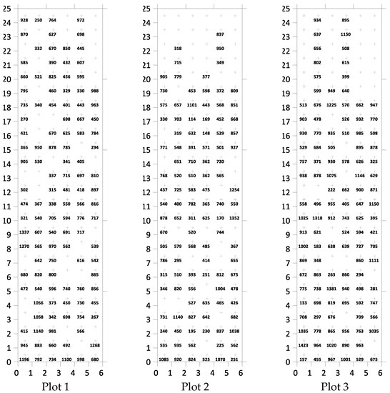 The CV values of Point Kriging interpolated all harvested plant data in the three plots ranged from 31.4% to 35.8%, while the calculated means ranged from 600 to 728 (Table 3). Regarding the harvested plants without the margin ones, the CV and mean values ranged from 29.5% to 35.9% and from 558 to 720, respectively. As the original and log10-transformed data, the second field plot produced a lower mean value and a higher CV value as compared to the other two plots.