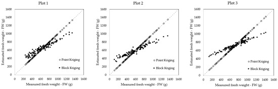 Original fresh weight (FW) vs. estimated data using point and Block Kriging in the three field plots (Plots 1–3).