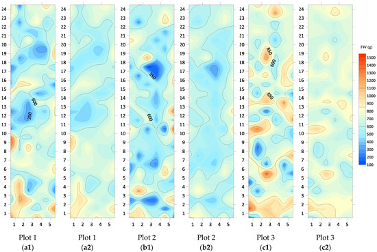 Contour maps for interpolated fresh weight (FW) data in the three plots, where (a1,b1,c1) correspond to Point Kriging and (a2,b2,c2) to Block Kriging.