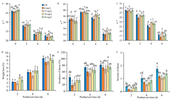 The skin color, weight loss, decay incidence, and decay severity of strawberry fruit either untreated or treated with sodium selenite. L* (A), a* (B), and b*(C) values, weight loss (D), incidence of decay (E), and decay severity (F) of strawberry fruit during postharvest storage under Se treatment at different concentrations. All data were expressed as the mean values ± standard deviation. The letters indicate the statistically significant difference at p ≤ 0.05 based on the ANOVA analysis with LSD test.