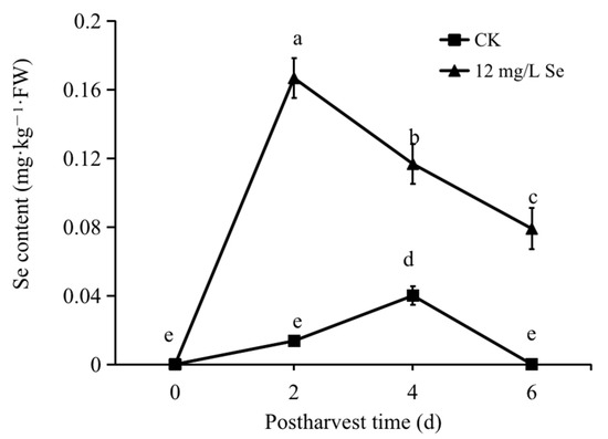 The Se content in sodium selenite-treated or untreated strawberry fruit during storage. All data were expressed as the mean values ± standard deviation. The letters indicate the statistically significant difference at p ≤ 0.05 based on the ANOVA analysis with LSD test.