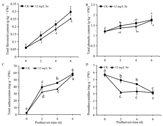 The total flavonoid (A), phenolic (B), anthocyanins (C), and proanthocyanidins (D) contents in Se-treated or untreated strawberry fruit during postharvest storage. All data were expressed as the mean values ± standard deviation. The letters indicate the statistically significant difference at p ≤ 0.05 based on the ANOVA analysis with LSD test.
