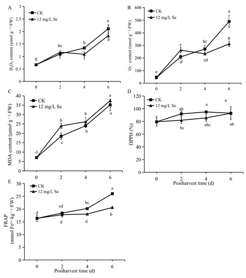 The changes in H2O2 (A), O2− (B), MDA (C), DPPH (D), and FRAP (E) in Se-treated or untreated strawberry fruit during storage. All data were expressed as the mean values ± standard deviation. The letters indicate the statistically significant difference at p ≤ 0.05 based on the ANOVA analysis with LSD test.