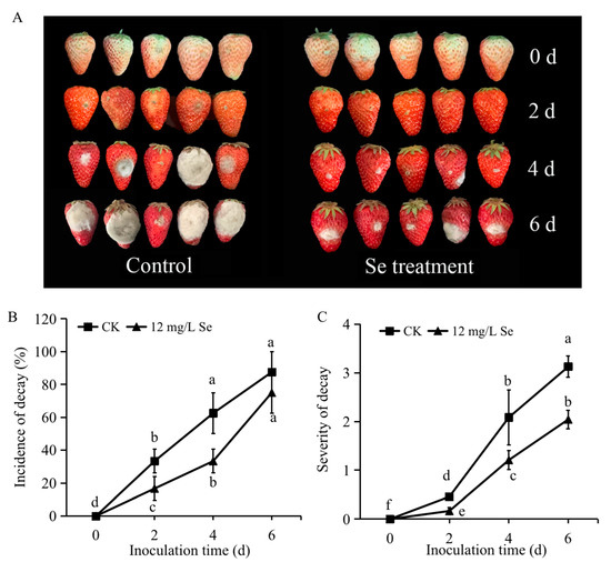 The effects of Se treatment on the defense of strawberries against B. cinerea. (A), the symptoms of Se-treated or untreated strawberry fruit infected with B. cinerea; (B), the incidence of gray mold decay; (C), the severity of decay. All data were expressed as the mean values ± standard deviation. The letters indicate the statistically significant difference at p ≤ 0.05 based on the ANOVA analysis with LSD test.