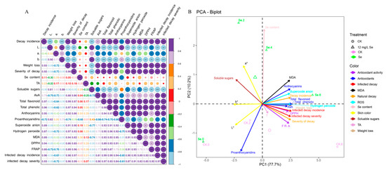 To better learn the relationship between nutritional variables during strawberry postharvest under Se treatment, a correlation analysis was carried out. As the results show (Figure 6A), the skin color indicators L*, a*, and b* showed significantly negative correlations with most other variables, such as AsA, hydrogen peroxide, FRAP, and the decay severity after B. cinerea inoculation. Similarly, the soluble sugar content showed a positive correlation with the b* value, with a negative correlation with other traits except for the a* value, Se content, TA, and proanthocyanidin content. On the contrary, the anthocyanins, H2O2, O2−, MDA, DPPH, and FRAP, and the incidence and severity after B. cinerea inoculation exhibited positive correlations with most variables but negative correlations with the L* and b* values. Interestingly, the content of Se and TA did not show any significant correlations with any other variables.