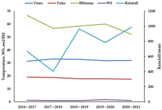 Weather parameters maximum temperature (Tmax; °C), minimum temperature (Tmin; °C); relative humidity (RH) mean (RHmean; %), wind speed (WS; km h−1), and rainfall (mm) during the study period (2016–2021).