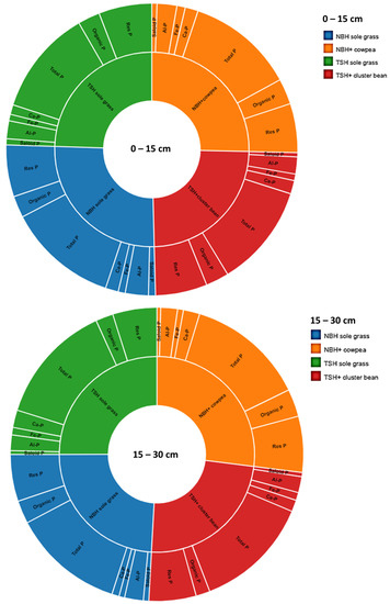 In the surface layer, saloid-P decreased by −25 and −29% in the NBH + cowpea and TSH + cluster bean intercropping systems in comparison to the monoculture NBH and TSH, respectively (Figure 2). Al-P decreased by −14 and 5% in the NBH + cowpea and TSH + cluster bean intercropping systems in comparison to the monoculture NBH and TSH, respectively (Figure 2). Nearly a −15% increase was observed in the NBH + cowpea intercropping for Fe-P for a 0–15 cm soil depth in comparison to the monoculture NBH grass. However, no significant difference was observed in the Fe-P pool of phosphorus in the TSH + cluster bean intercropping system in comparison to the monoculture TSH System (Figure 2). No significant difference was observed in the Ca-P in the NBH + cowpea intercropping system and monoculture NBH, however, the TSH + cluster bean intercropping system exhibited a −40% increase in the Ca-P pool in comparison to the monoculture TSH (Figure 2). No significant difference was observed in the total P and Res-P pools of phosphorus in both the NBH + cowpea and TSH + cluster bean intercropping systems in comparison to the monoculture crop (Figure 1). Nearly an 18 % increase was observed in the NBH + cowpea intercropping for organic-P for a 0–15 cm soil depth in comparison to the monoculture NBH grass, however, no significant difference was observed in the TSH + Cluster bean intercropping system (Figure 2).