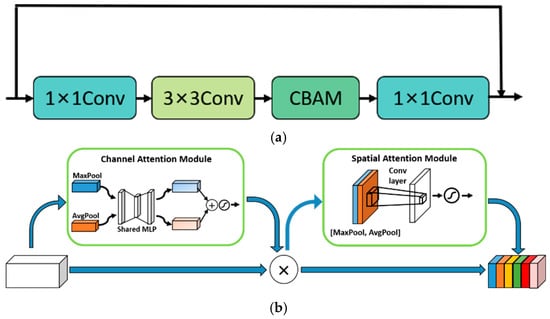 Convolutional Block Attention Module (CBAM). In the human visual system, the sensory system is able to screen out useful information and ignore irrelevant information. This behavior is known as the human brain attention. Inspired by this mechanism, researchers have proposed various attention mechanisms, which have been widely used in the field of computer vision. The nature of the attention mechanism is to distinguish key features from non-key features by applying more weights to the parts with higher levels of interest in the model, so as to help the model focus on the features in the region of interest. This is conducive to extracting key information and making more precise judgments. All the data in this paper were collected in the field environment, and the image backgrounds contained a variety of interference factors such as soil, water pipes, plastic films, fallen leaves, etc. These factors might easily exert adverse effects on the extraction of disease features. The use of the attention mechanism can make up for this deficiency of the convolutional neural network. The visual attention modules currently in use can be roughly divided into the channel attention modules, spatial attention modules and channel spatial attention modules. The channel attention modules and spatial attention modules can only refine features along the channel or spatial dimension, which limits their flexibility in learning the attention weights that change with the channel and space. The model we intended to build in this paper needed to take into account both spatial information and channel information, so we decided to add a channel spatial attention module, i.e., the CBAM [35], to the residual structure in order to guide the model to focus on key regions of the image. The optimized residual module is shown in Figure 5a. CBAM takes into account both spatial attention and channel attention. Its specific structure is shown in Figure 5b. In CBAM, the input feature is sequentially multiplied by the output of the channel attention module and the output of the spatial attention module. In the channel attention module, the feature F first aggregates the spatial information of the feature map through operations of the average pooling layer and maximum pooling layer to generate two different spatial context features, namely, the average pooling feature and the maximum pooling feature. Then, the average pooling feature and the maximum pooling feature further generate the channel attention feature () through a shared network called Multi-Layer Perceptron (MLP). In the spatial attention module, same as the channel attention module, the channel feature is first aggregated along the channel direction through the maximum pooling layer and the average pooling layer, and then the two-dimensional spatial attention feature () is generated through a standard convolution layer. Finally, the feature F multiplies with and , respectively, to obtain the output feature O. The formula of CBAM can be expressed by Equations (1)–(3) as follows: