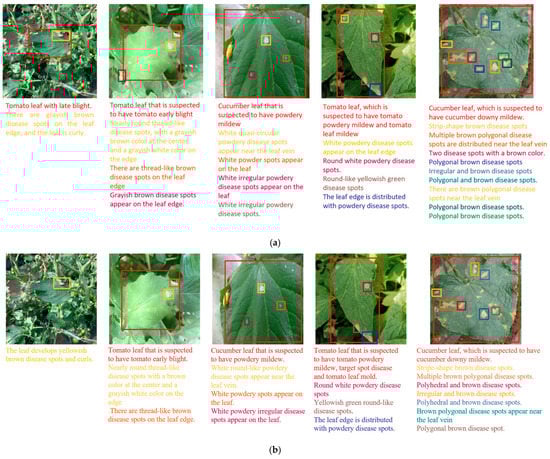 The datasets used in this study contained only the diseased leaf images with obvious features selected by manual screening, and 99.98% of the images involved only one disease category. In the field environment, the dense captioning for vegetable leaf disease images is still a tough task, mainly due to the following three reasons.