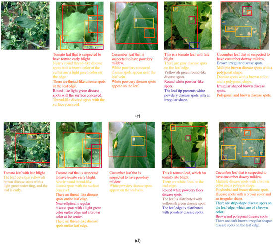 (1) Vegetable leaves may present different kinds of disease spots. Affected by the planting environment, one vegetable plant may be infected with multiple leaf diseases, and the leaf may show features of different diseases. When some diseases have similar features, especially when the disease spots are overlapped, it will affect the model in extracting visual features and generating text descriptions, thereby reducing the precision of positioning and image captioning. Therefore, it is necessary to enhance the learning ability of the model to the characteristics of mixed diseases by expanding the leaf data of mixed diseases, strengthen the ability of the model to extract different disease features and the detection ability of the edge pixels of disease spots, so as to improve the model’s ability to identify mixed diseases.