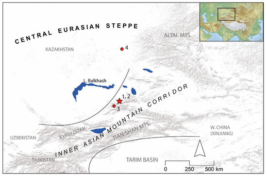 - Hermes, T.R.; Doumani Dupuy, P.N.; Henry, E.R.; Alexey, M.M.; Mar’yashev, N.; Frachetti, M.D. The Multi-Period Settlement Dali in Southeastern Kazakhstan: Bronze Age Institutional Dynamics along the Inner Asian Mountain Corridor. Asian Perspect. 2021, 60, 345–381. [Google Scholar] [CrossRef]