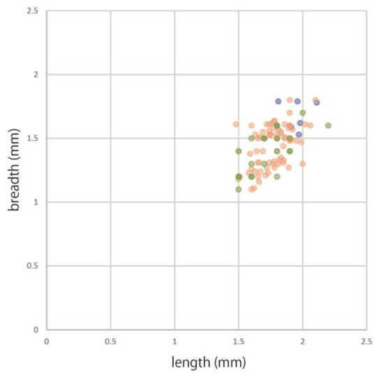 Comparison of the length and breadth measurements of impressions of S. italica among four different regions (blue: Kazakhstan, pink: Japan, green: Korea).