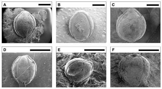 Impression images of P. miliaceum and S. italica from various parts of Eurasia: (A) P. miliaceum of Ukraine (the Novokyivka site, 1600–1300/1200 BC [18]). (B) P. miliaceum of Kazakhstan (the Tasbas site, 1208–1054 BC). (C) P. miliaceum of Japan (the Kitakata-kitanohara site, the late half of the 1st millennium BC). (D) S. italica of Kazakhstan (the Begash site, 1625–1000 BC). (E) S. italica of Far East Russia (the Zhertyj Yar site, 1835–1685 BP [17]). (F) S. italica of Japan (the Kitakata-kitanohara site, the late half of the 1st. millennium BC). Scale bars = 1 mm.