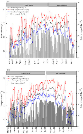 An integrated cultivation experiment was conducted in Liuyang County, Hunan Province, China (28°09′ N, 113°37′ E, 43 m a.s.l.). The climate at the site was a subtropical humid monsoon with a mean annual precipitation of 1171.6 mm and average daily temperature of 17.3 °C; the maximum and minimum daily temperature were 37.7 °C and −4.7 °C, respectively. Detailed information about daily temperature and solar energy are provided in Figure 1. The soil at the site was clay with a pH of 6.3, 1.84% organic C, and 0.11% total N.