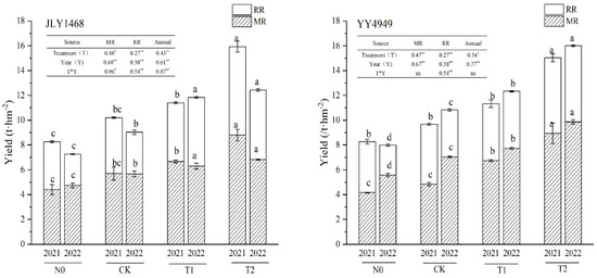Grain yield variation among different cultivation models in 2021–2022. MR, main rice; RR, ratoon rice; JLY1468, Jingliangyou 1468; YY4949, Yongyou4949; CK, the farmers’ practice model; T1, high-yield and high-efficiency model; T2, enhanced-high-yield and high-efficiency model; and N0, the no-N model, *, the is significant difference (p < 0.05); **, the is extremely significant difference (p < 0.01); ns, the interaction is not significant difference; data followed by different letters are significantly different at the 0.05 probability level.