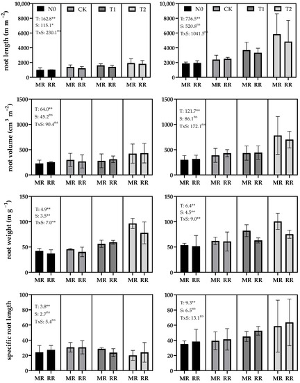 Root length, root volume, and root weight per m2 of the T2 were significantly higher than that of the CK. There was a significant difference in specific root length between the varieties. The average specific root length of T2 in the variety ‘YY4949’ was 59 m g−1 for the main rice and 64 m g−1 for the ratoon rice, respectively, which was significantly higher than that of the CK. The average specific root length of CK in the variety ‘JLY1468’ was 31 m g−1 for the main rice and 31 m g−1 for the ratoon rice, respectively, which was significantly higher than that of T2 (Figure 4).