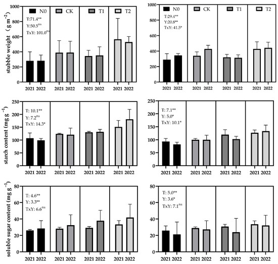 The average stubble weight of the T2 were 547 g m−2 of the variety ‘JLY1468’ and 434 g m−2 of the variety ‘YY4949’, respectively, showing a significant increase of 40.4% and 13.4% compared with CK (Figure 5). A significant difference was observed between the T2 and the T1 (p < 0.01), and the CK (p < 0.01). In addition, T2 had higher non-structural carbohydrate contents, including starch and soluble sugar. The starch content of T2 was 35.7% for ‘JLY1468’ and 30.3% for ‘YY4949’, while the soluble sugar content for T2 was 23.8% for ‘JLY1468’ and 16.8% for ‘YY4949’, which was higher than that of the CK (Figure 5).