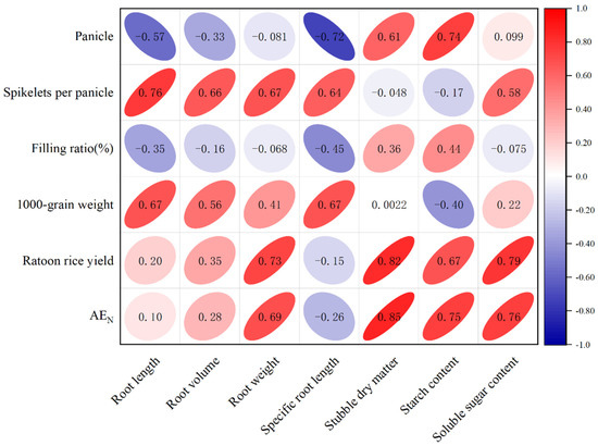 Therefore, root weight, stubble weight, and their non-structure carbohydrate contents were the most important factors influencing ratoon rice grain yield and AEN. Additionally, there was a significant positive correlation between root weight and stubble weight (p < 0.05), while significant positive correlation was observed between root weight and soluble sugar content (p < 0.01).