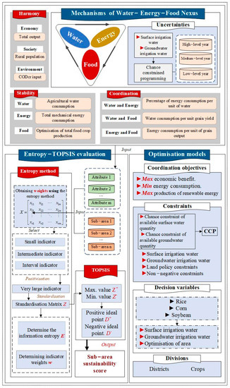 The optimisation and evaluation approach proposed in this section consists of four main modules: the agricultural WEFN system module, the evaluation module, the optimisation module and the uncertainty module. First, the WEFN system includes subsystems and impact sectors, involving water systems, energy systems, food systems and their coupled systems, as well as economic, social and environmental aspects. The optimisation model was constructed considering three factors: the objective function, the constraints and the decision variables. The objective function starts with the renewable energy in the area and involves maximising economic efficiency and energy recovery, as well as maximising renewable energy. The constraints include irrigation water use and acreage. The decision variables include surface water irrigation water, groundwater irrigation water, optimised area, surface water use and groundwater use. The evaluation module is mainly based on the entropy-weighted TOPSIS method, where weights were obtained using the entropy-weighted method and the scores for each subregion were calculated and normalised based on the weights using the TOPSIS method. For the uncertainty module, chance-constrained programming (CCP) was chosen to address the uncertainties in the module.